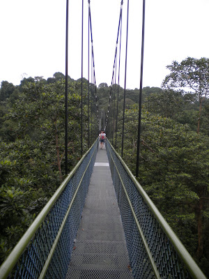 Our main interest in MacRitchie was to do a "hike" in a more rural area, but also see and walk on the Tree Top Walk, an elevated bridge across a small gorge in the park. (Truth told, you are never too far from the city anywhere in Singapore.) The bridge is about 250m in length, although the "walk" follows a boardwalk through the jungle area (some areas are boggy), which is about 1.2 Km in total. To reach the Tree Top Walk requires about 4.5 Km, and another 4 or 5 Km to get back, so all told, our hike was north of 10 Km. The journey took us in a complete loop around the edges of MacRitchie Reservoir. It took us about 4 hours.
